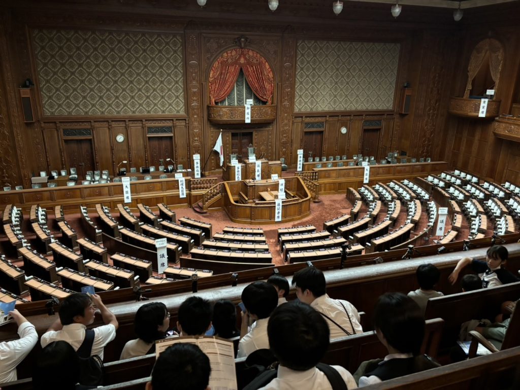 昼食後、国会議事堂に移動・見学を行いました。昨年度の宿泊研修では、岩手県議会場を見学しましたが、やはりそのスケールの違いに驚きました。